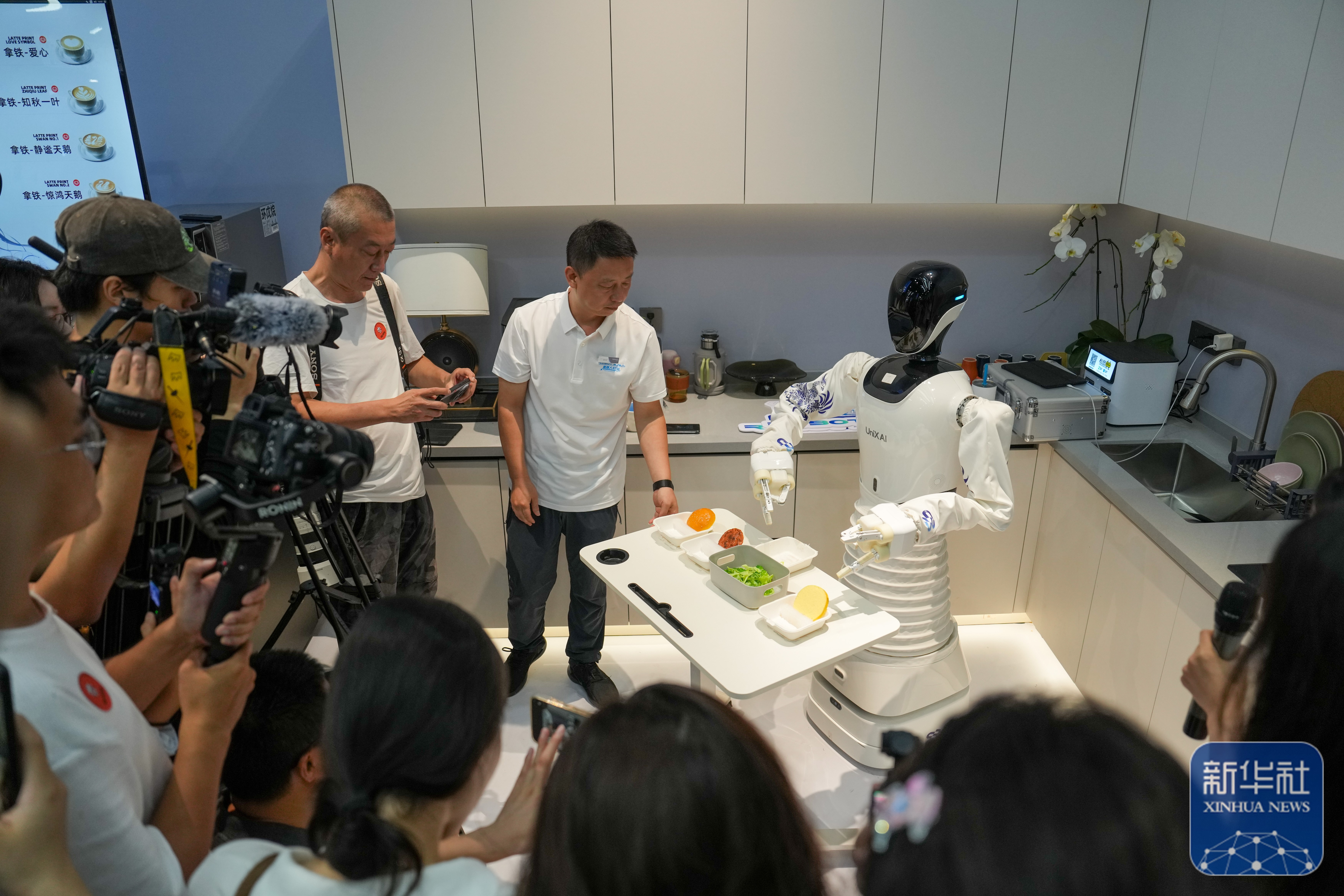 ↑ 在位于北京经开区机器人大世界的全球首个具身智能机器人4S店(ROBOT MALL)内,观众在观看一款机器人的厨艺表演(8月6日摄)。