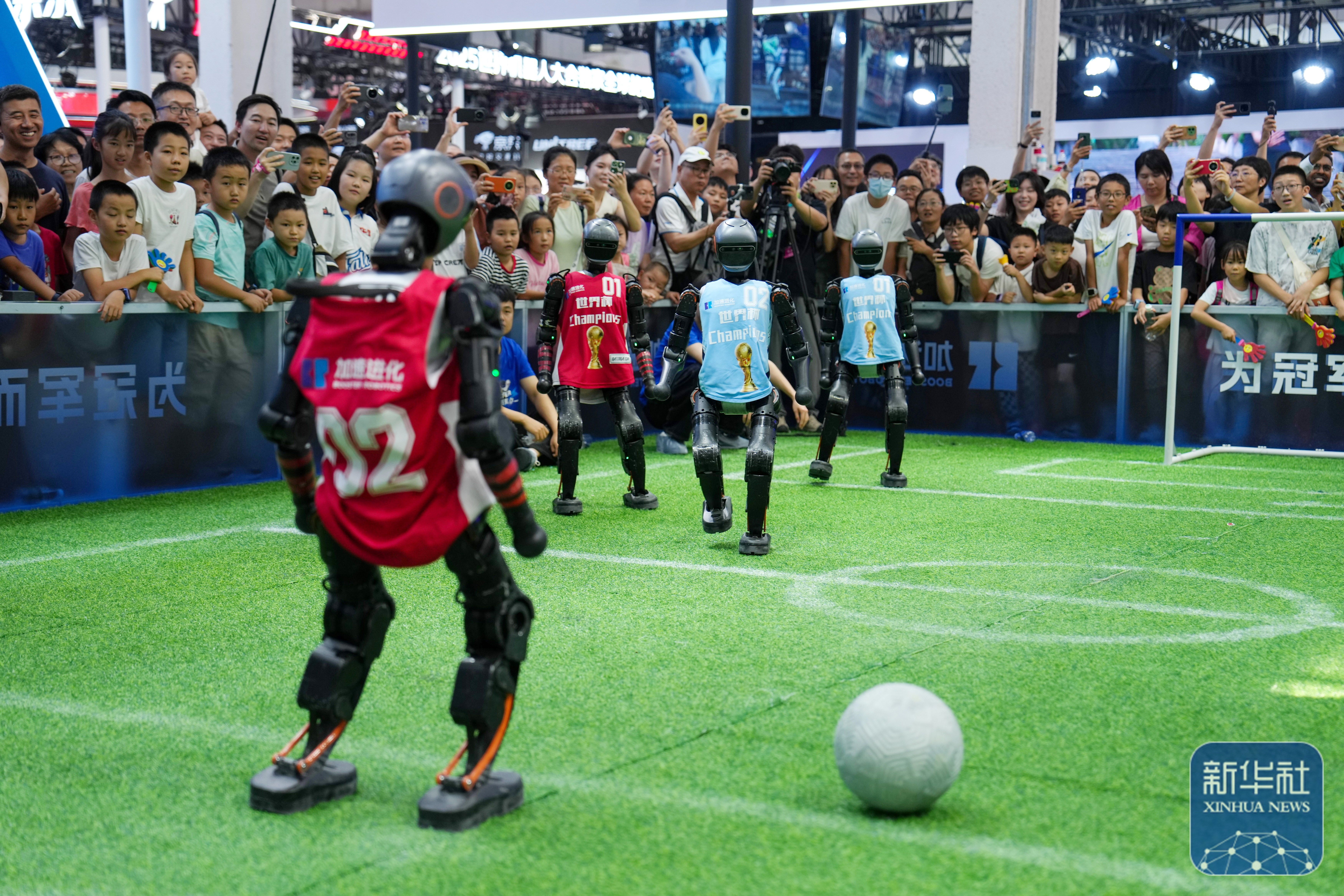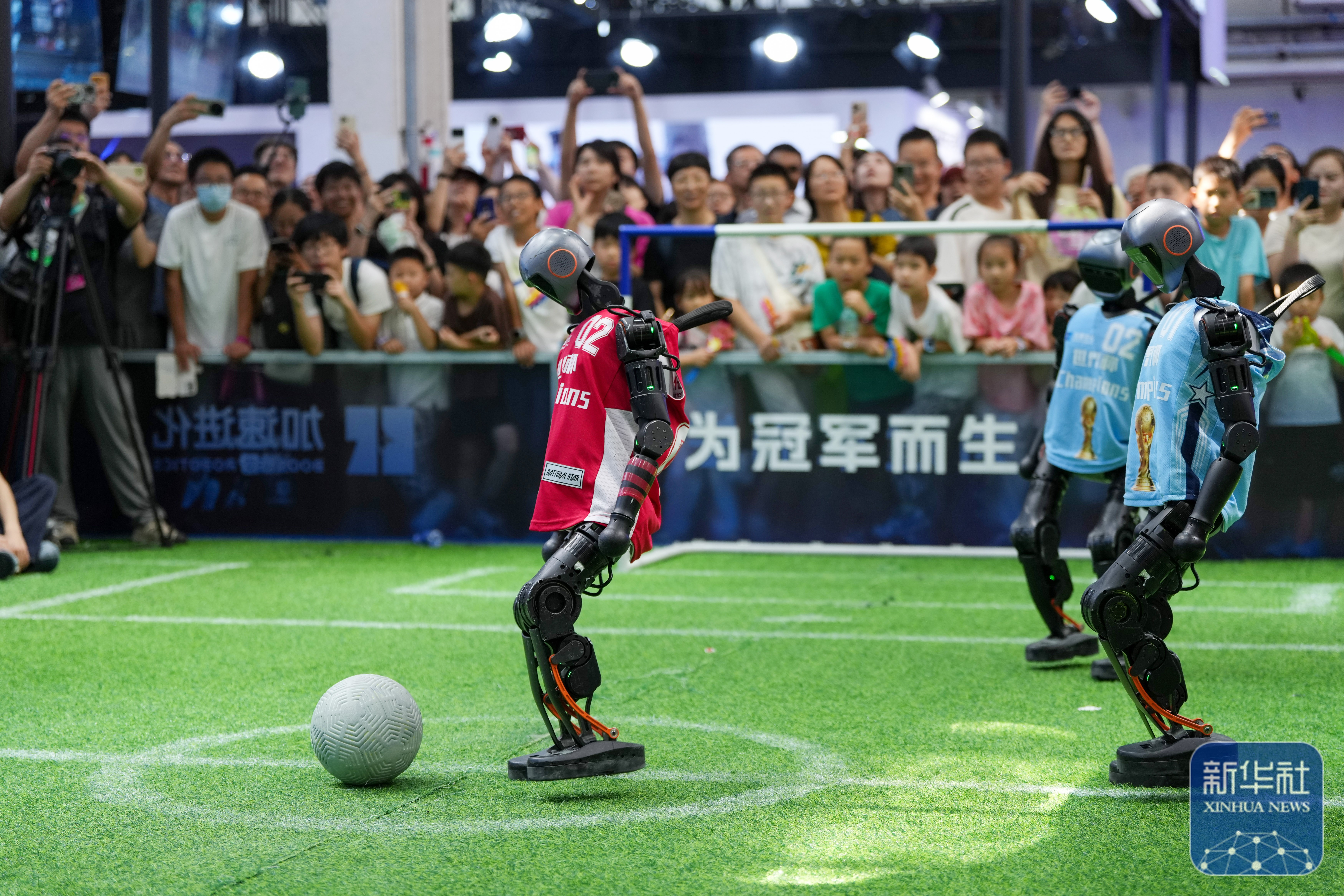 ↑ 在世界机器人大会展馆内,观众在加速进化公司展台观看人形机器人足球赛演示(8月11日摄)。