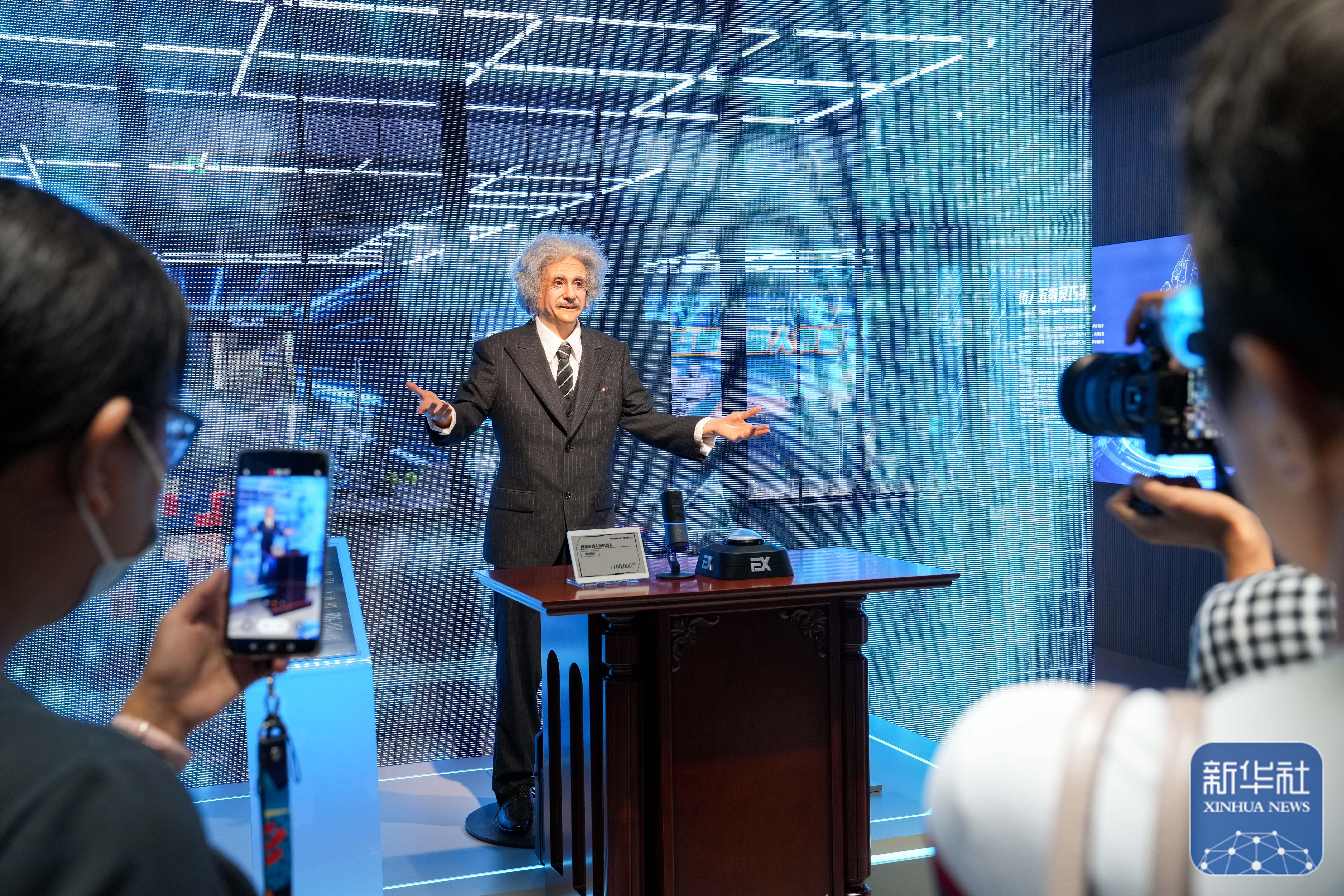 ↑ 在位于北京经开区机器人大世界的全球首个具身智能机器人4S店(ROBOT MALL)内,观众在观看一款人形机器人的互动展示(8月6日摄)。