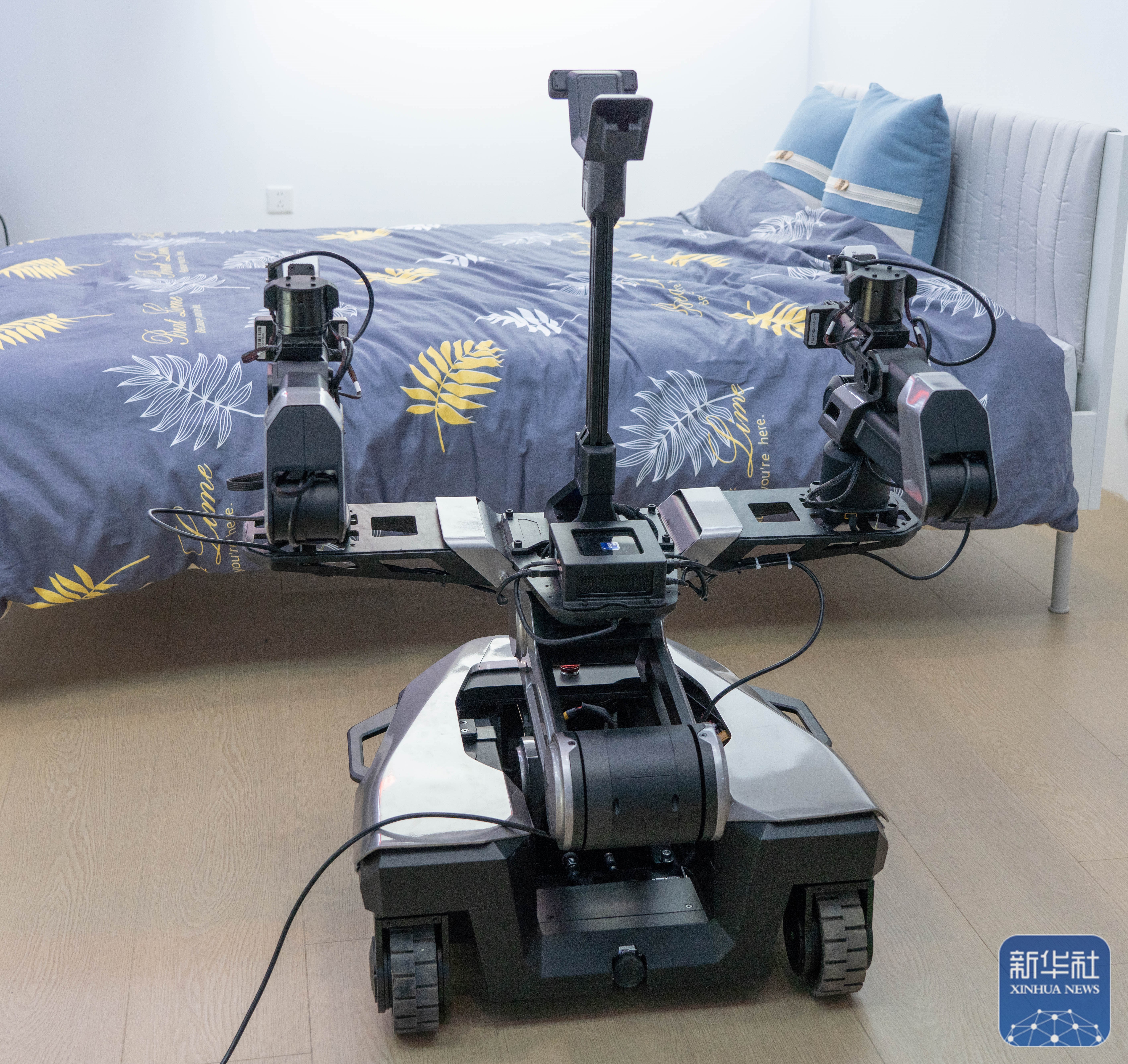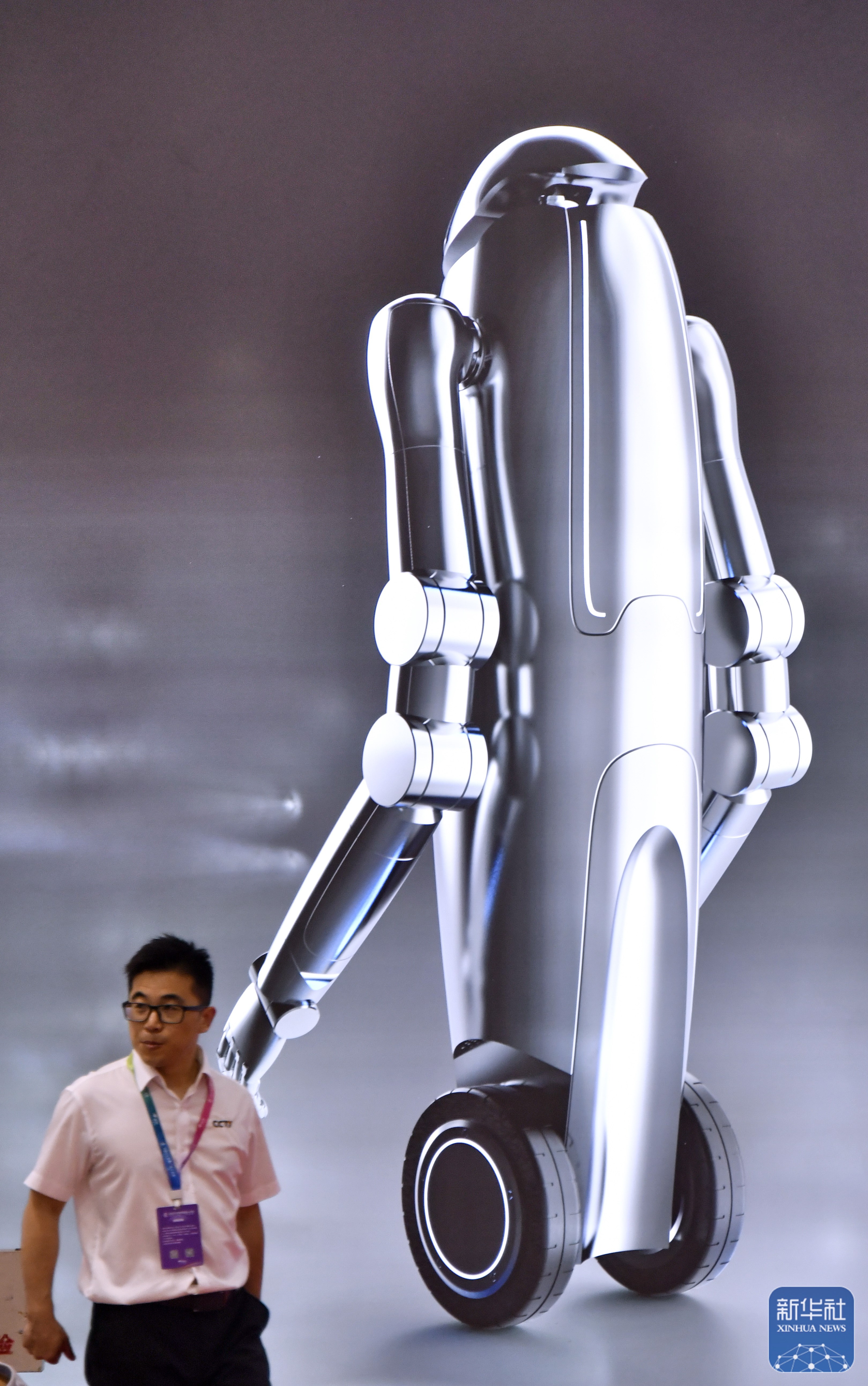 ↑ 世界机器人大会上展出的一款家务助理机器人(8月8日摄)。