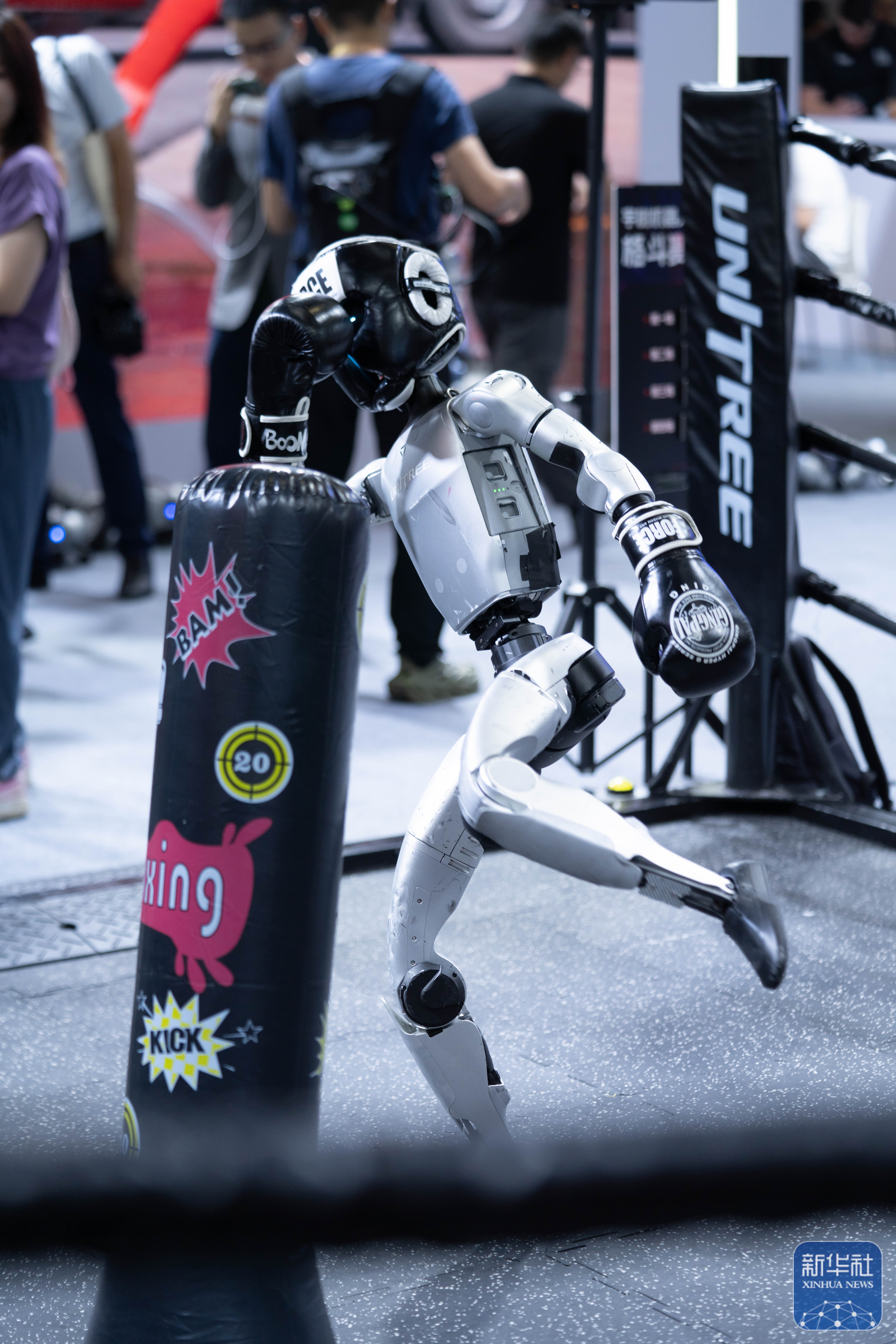 ↑ 在世界机器人大会展馆内,一款宇树机器人在进行拳击热身(8月8日摄)。