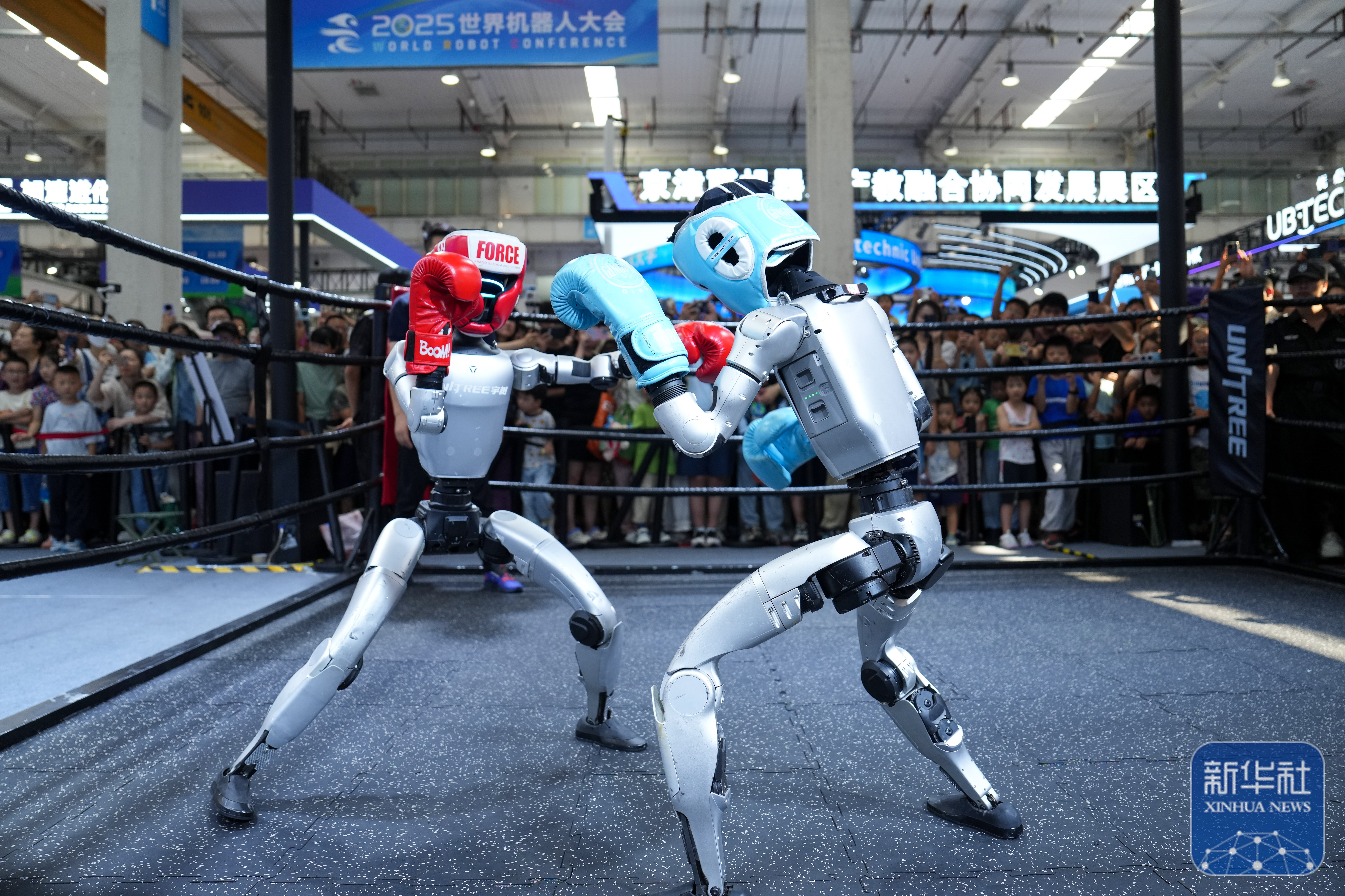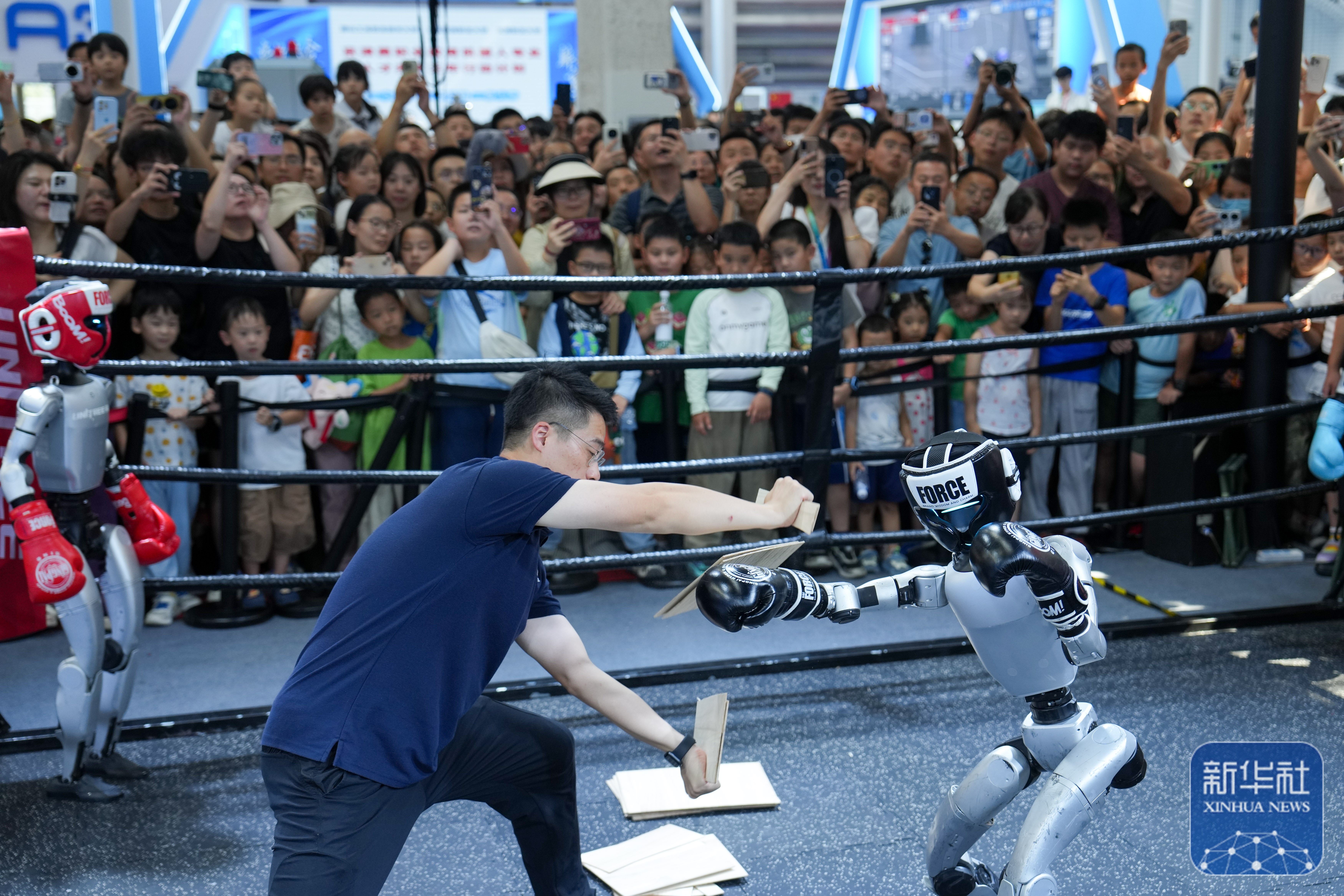 ↑ 在世界机器人大会展馆内,观众在宇树机器人展台观看机器人拳击展示(8月11日摄)。