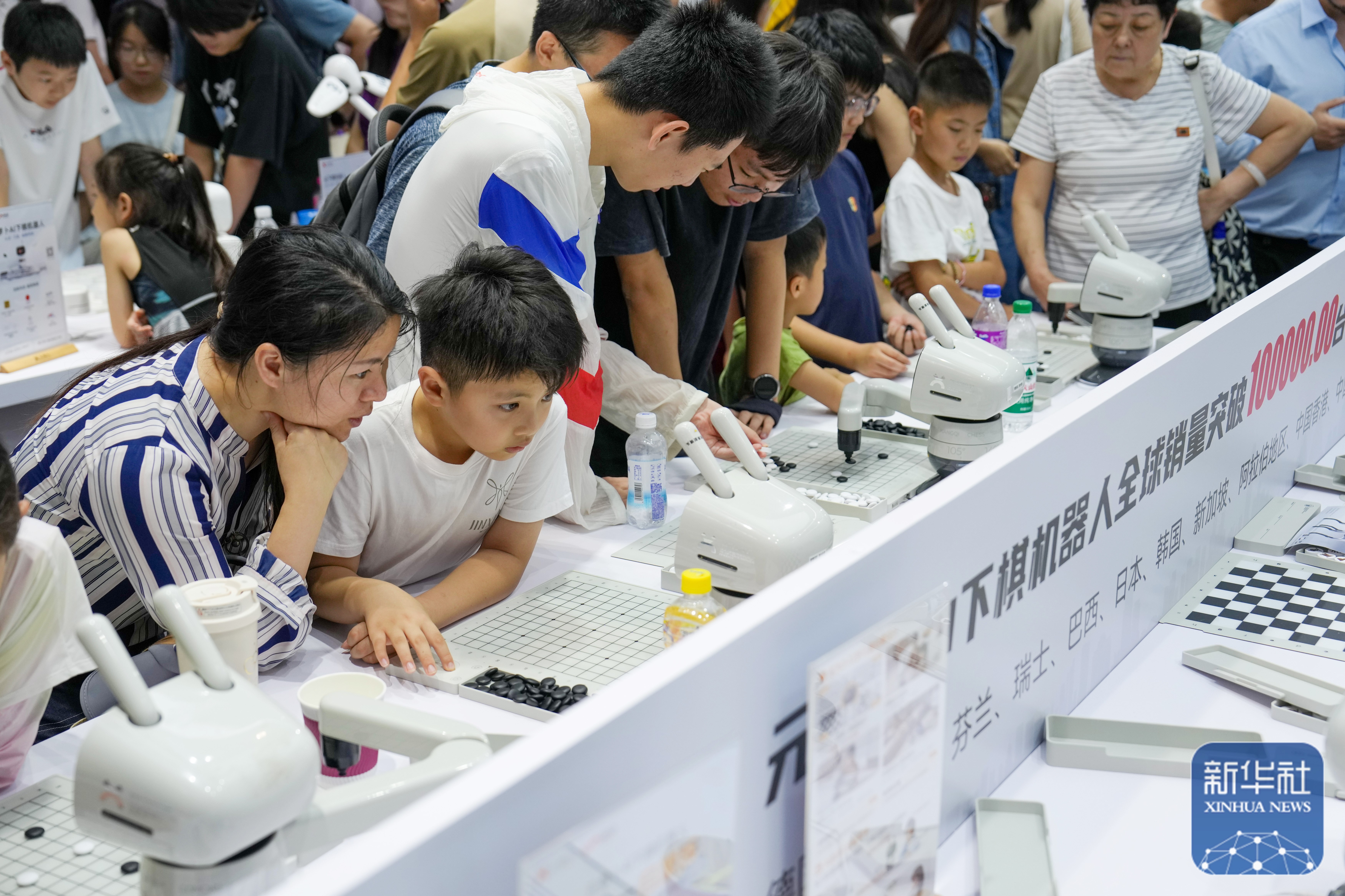 ↑ 在世界机器人大会展馆内,小朋友在与下棋机器人互动下棋(8月11日摄)。