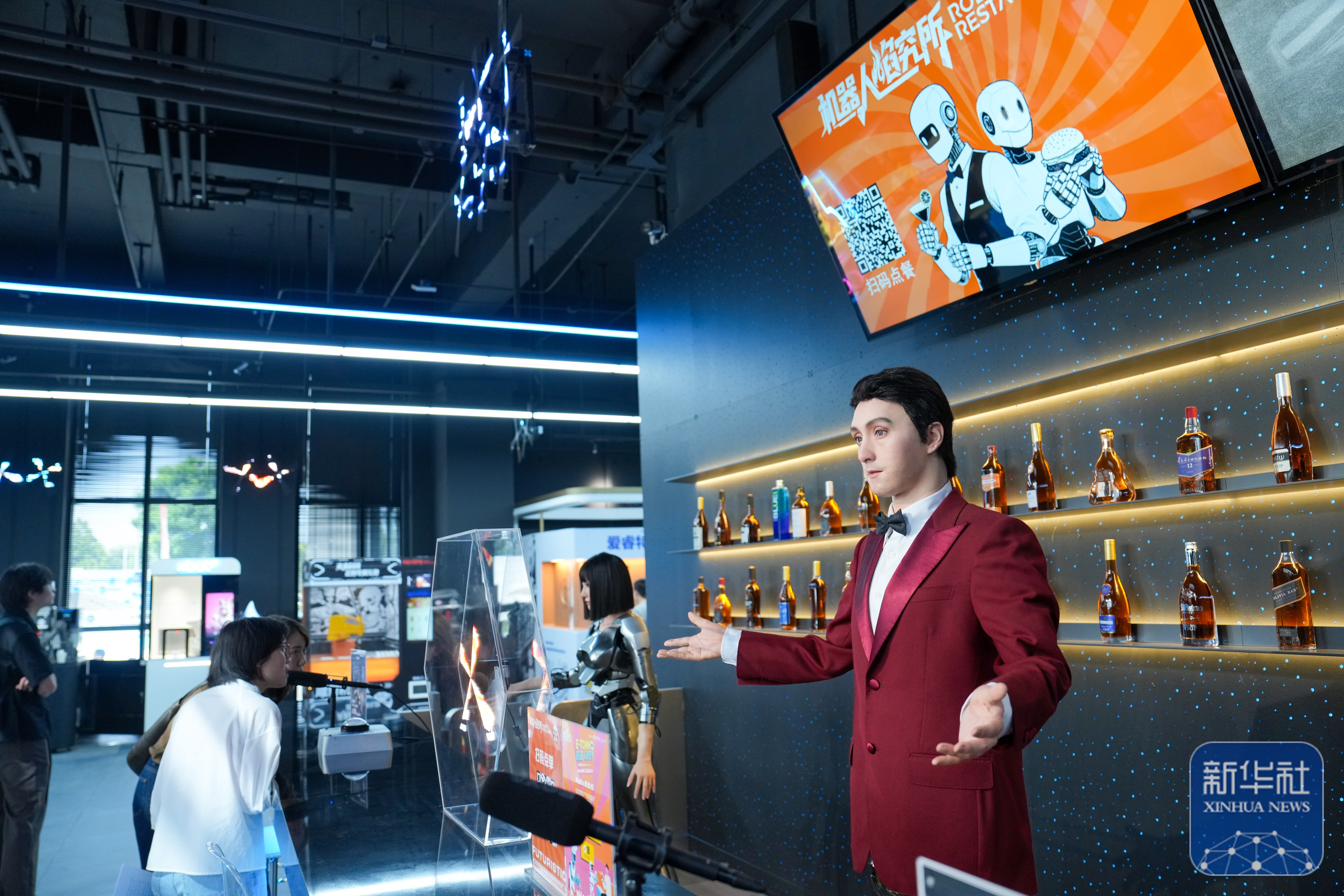 ↑ 在位于北京经开区的“机器人焰究所”主题餐厅内,一个迎宾人形机器人在跟顾客互动(8月6日摄)。