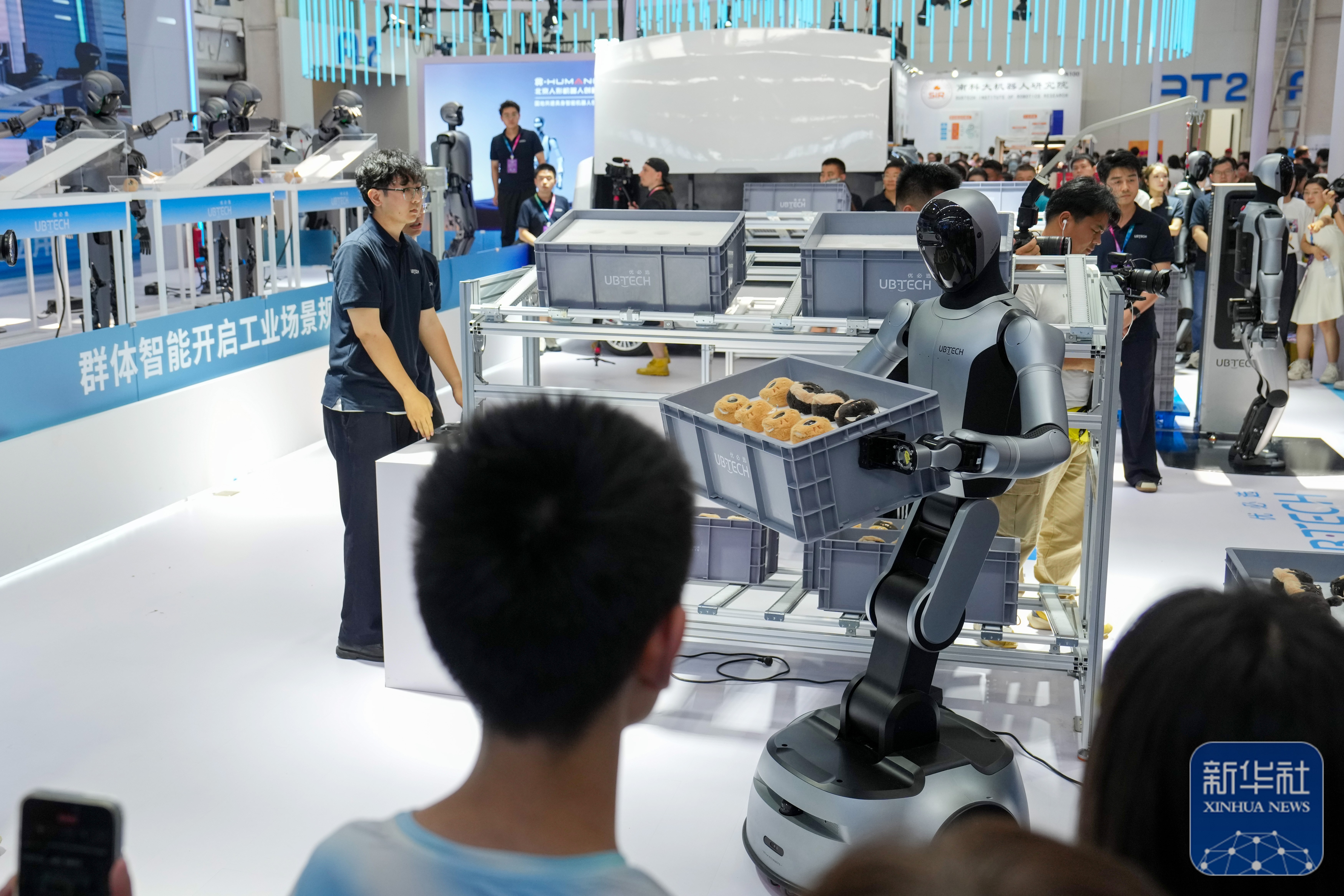 ↑ 在世界机器人大会展馆内,观众在优必选公司展台观看人形机器人从入库搬运到智能分拣的全流程作业展示(8月11日摄)。