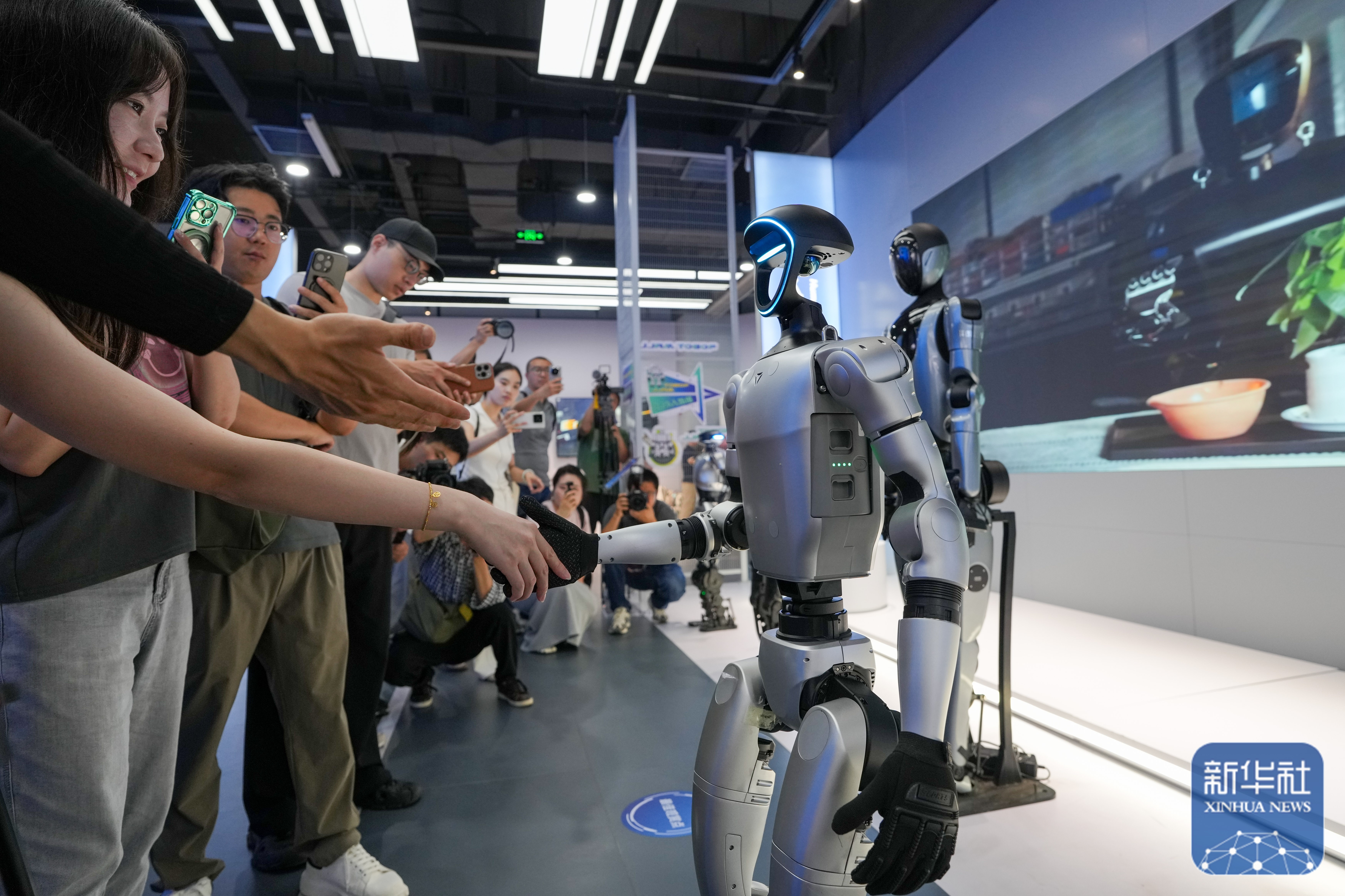 ↑ 在位于北京经开区机器人大世界的全球首个具身智能机器人4S店(ROBOT MALL)内,观众在与一款人形机器人握手(8月6日摄)。