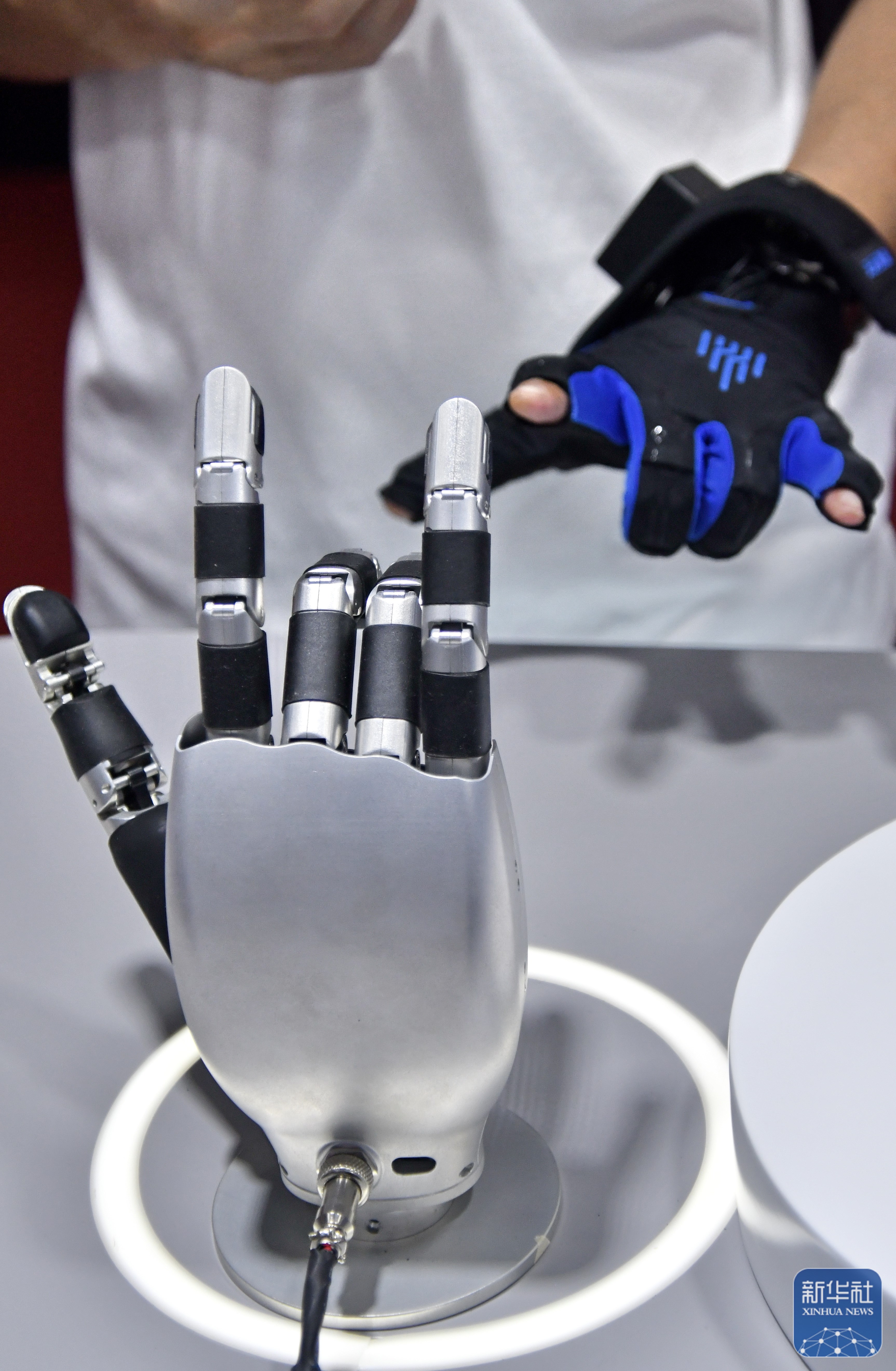 ↑ 在世界机器人大会展馆内,一款人形机器人灵巧手产品进行功能展示(8月11日摄)。