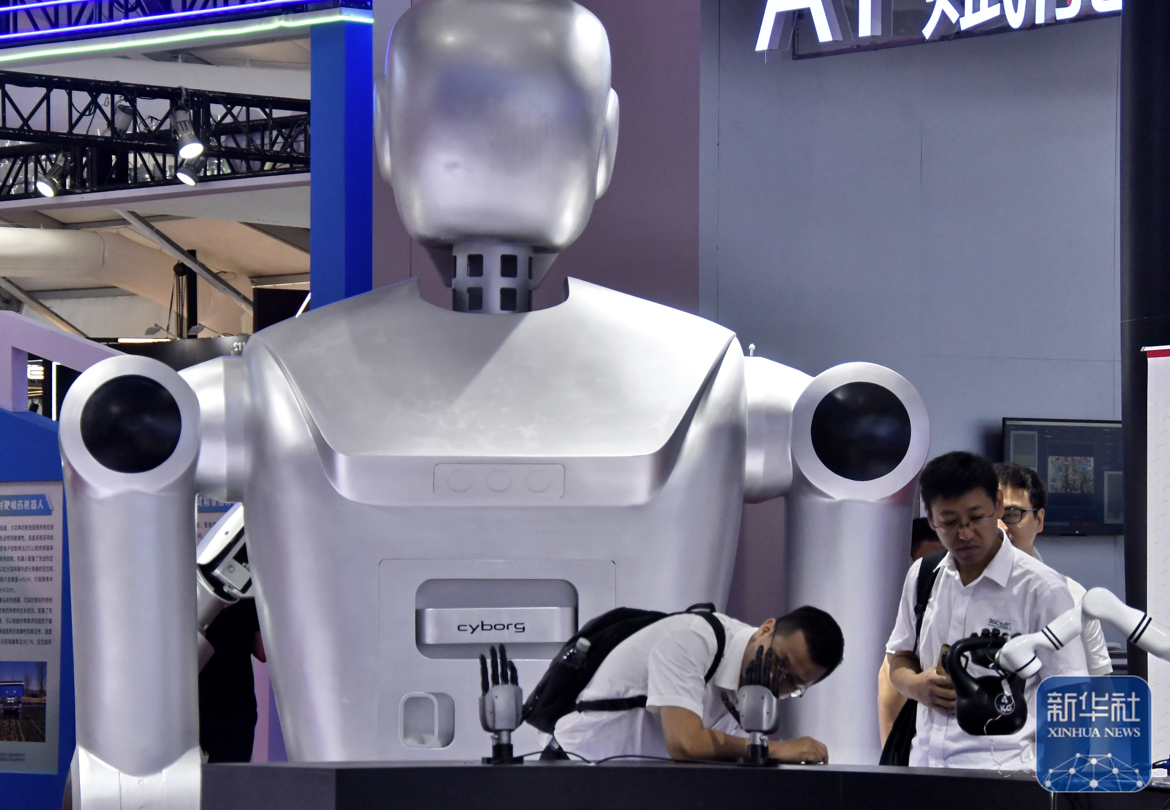 ↑ 在世界机器人大会展馆内,观众在参观展出的一款人形机器人智慧工厂自动化检测系统(8月11日摄)。