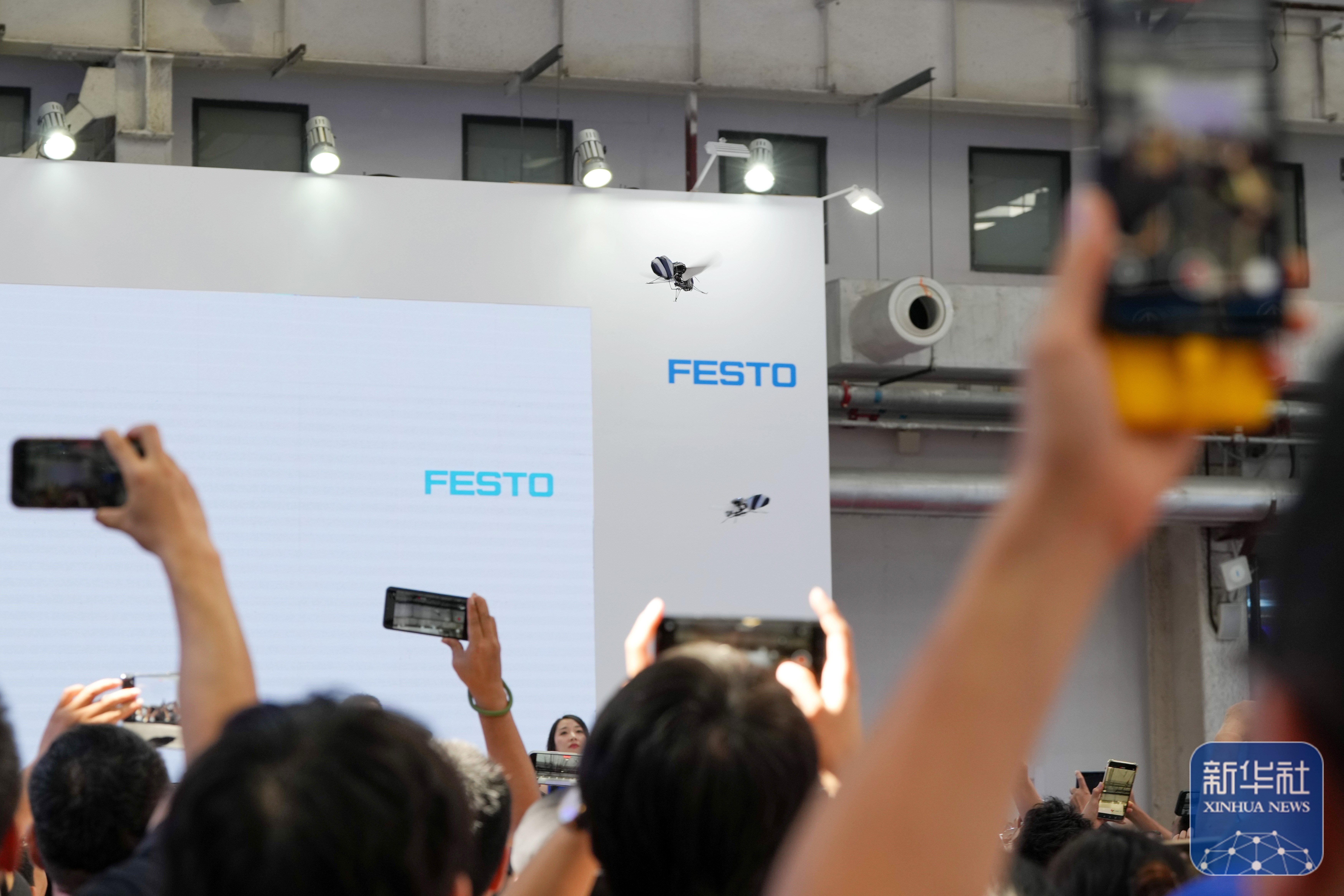 ↑ 在世界机器人大会展馆内,观众在观看一款仿生机器人飞行展示(8月11日摄)。