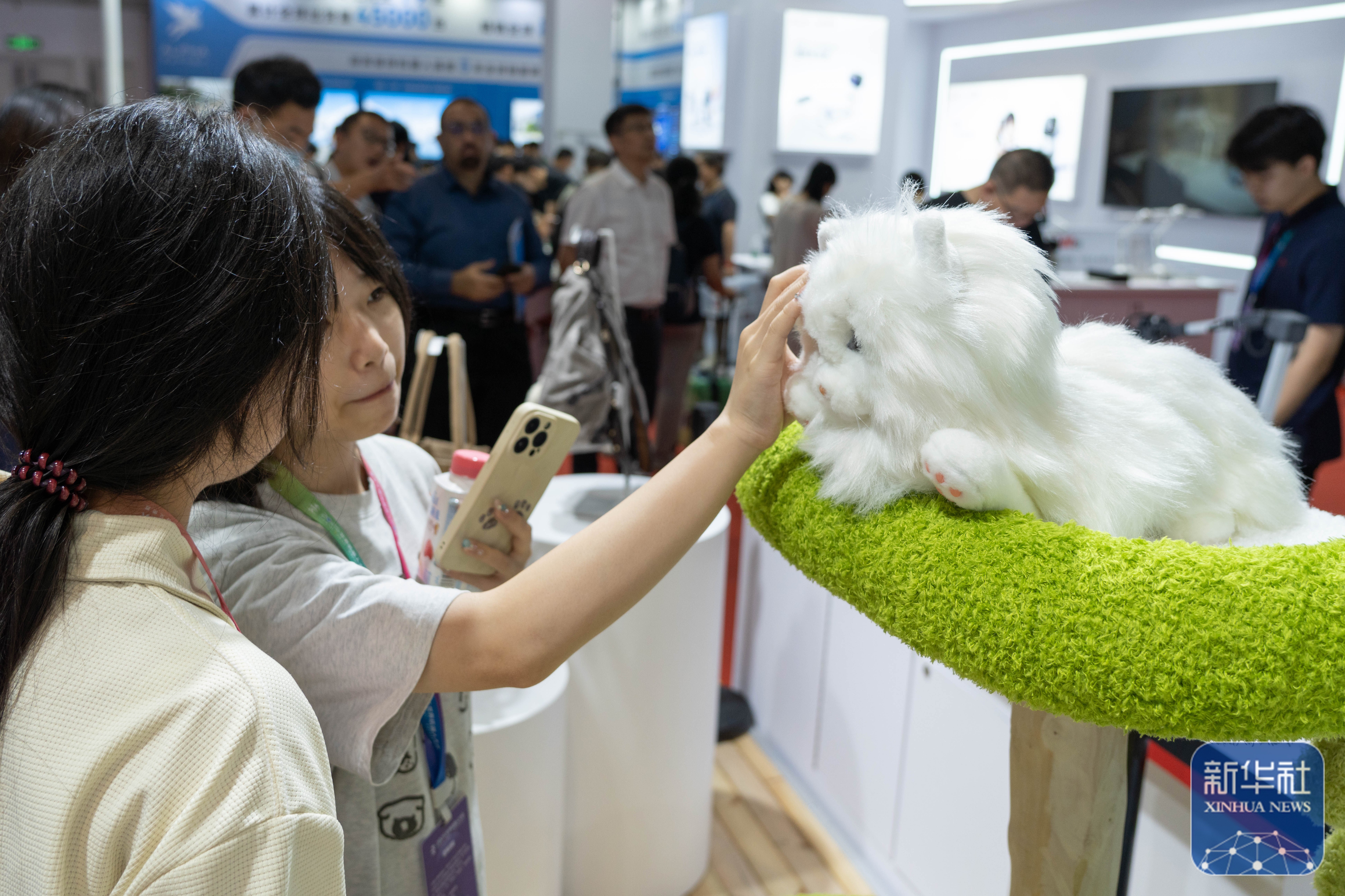 ↑ 在世界机器人大会展馆内,观众与一款机器宠物互动(8月8日摄)。