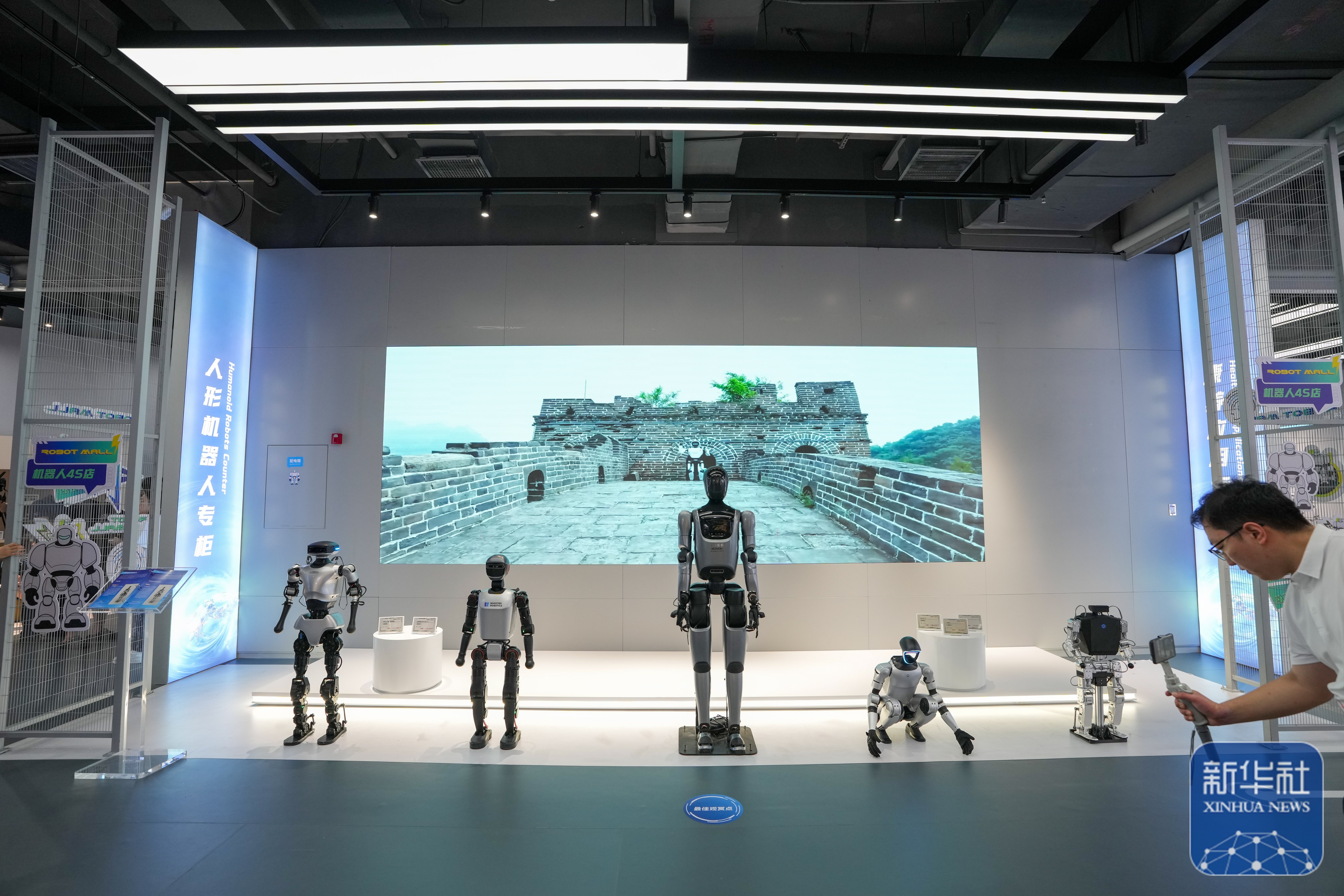 ↑ 在位于北京经开区机器人大世界的全球首个具身智能机器人4S店(ROBOT MALL)内,观众参观展出和可供出售的人形机器人(8月6日摄)。