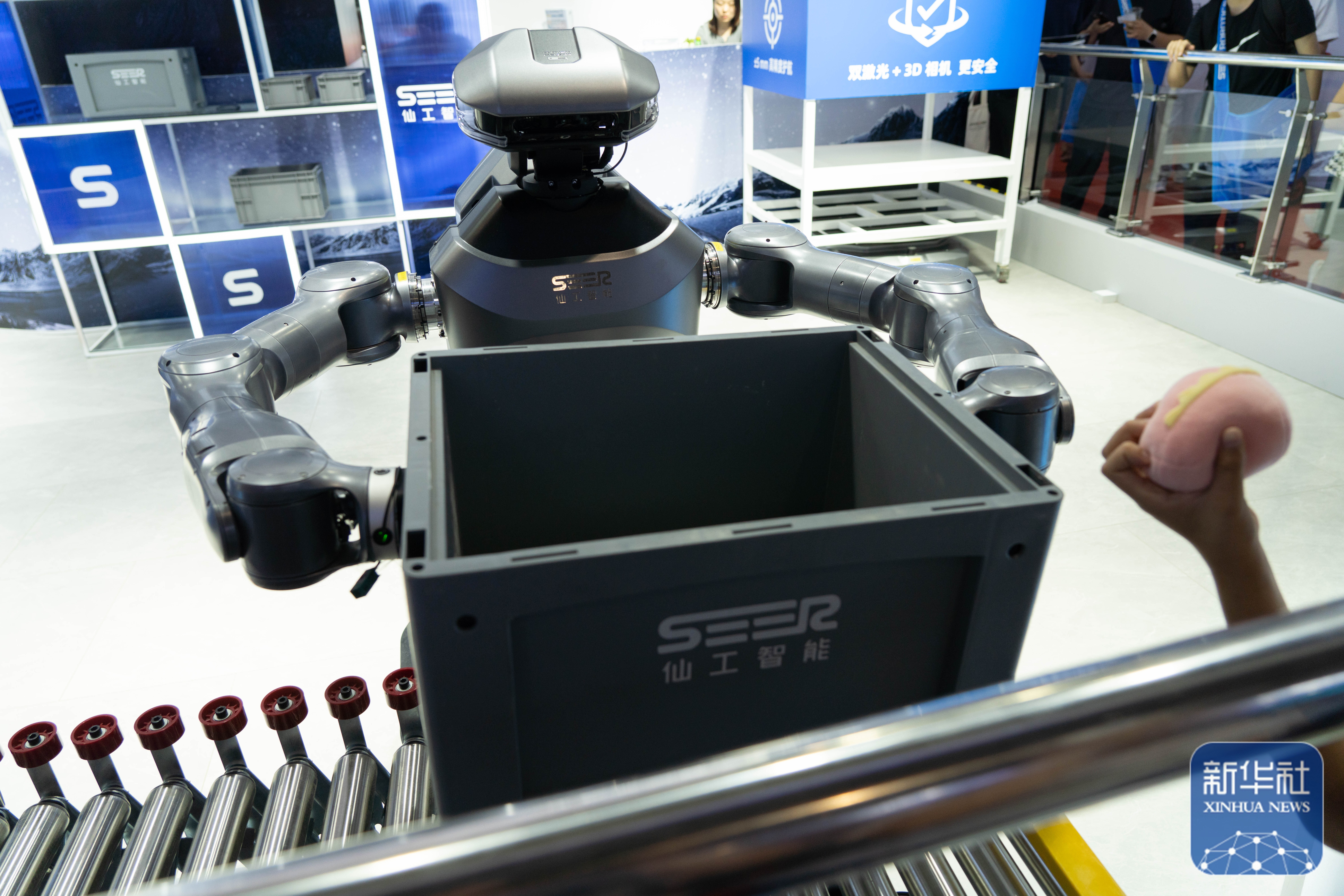 ↑ 在世界机器人大会展馆内,一款机器人在进行抓取物品功能展示(8月8日摄)。