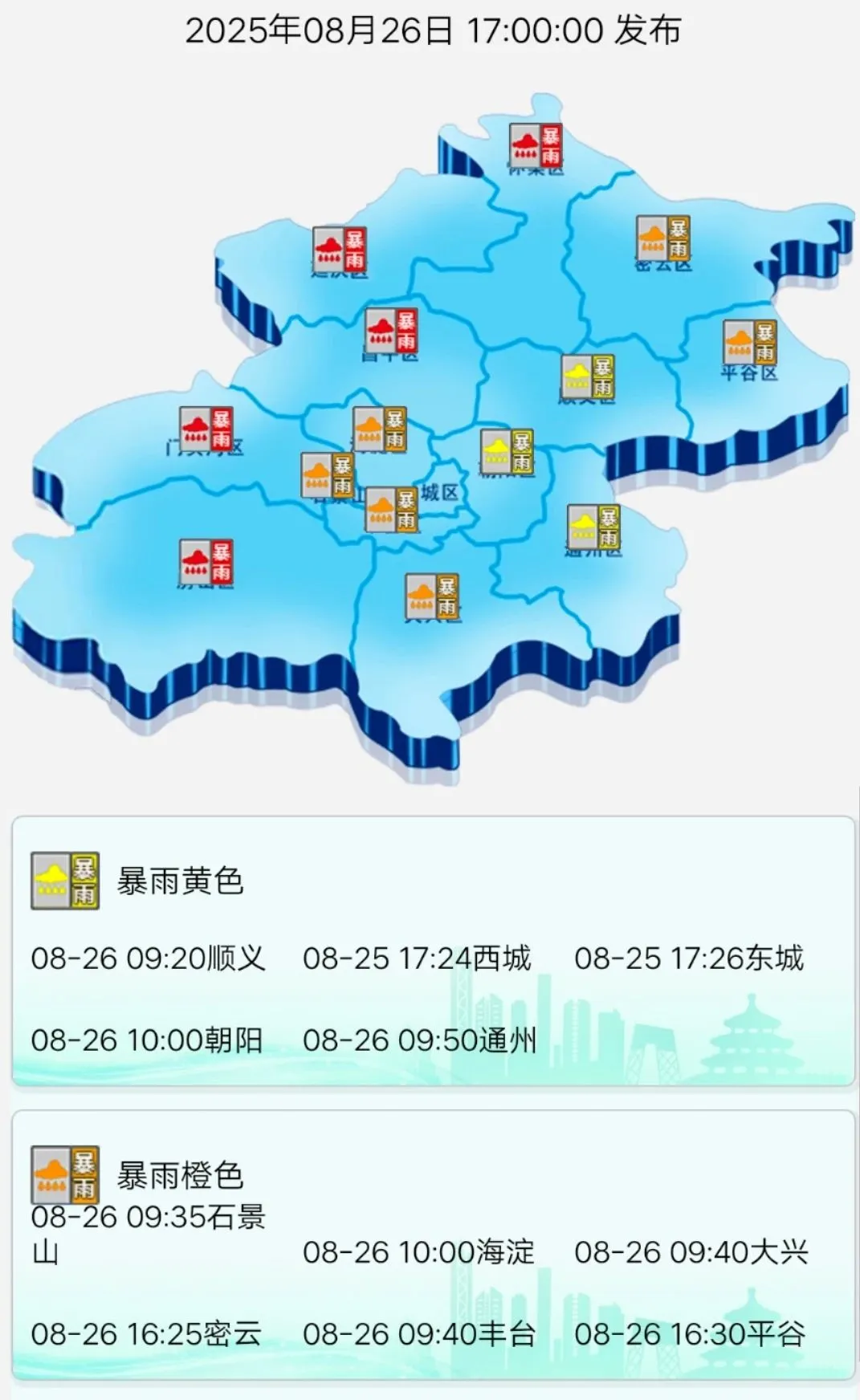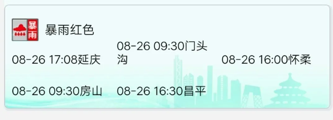 当前,北京全市暴雨橙色、地质灾害橙色、积水内涝黄色、山洪灾害黄色预警持续生效中,已启动全市防汛二级应急响应。门头沟、房山、怀柔、昌平、延庆区处于暴雨红色预警中。